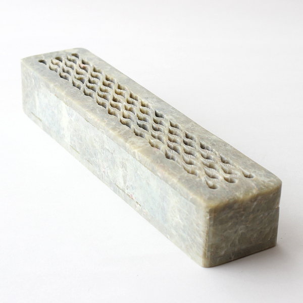 大変恐縮ながら、在庫を切らしております。 石製の香炉です。内部に灰や砂利を敷き、その上に火の着いたお香を寝かせて使います。 石の種類はソープストーン。暖炉などに使われることも多い、耐熱性の高い素材です。フタは蝶番で開け閉めする構造になっており、閉めた状態でもお香を焚くことができるので安全にご利用いただけます。 サイズ 約 230 x 50 x 40mm(幅 x 奥行 x 高さ) * 個体によってサイズは微妙に異なります * 天然石でできているため、色味・模様などがひとつひとつ異なります(恐縮ながら、色味や模様はご指定いただけません) * 内部に 石製香立 を置くことが可能です(香炉の中でお香を「立てても」「寝かせても」焚くことができ、お勧めです) * 蓋を閉めた状態でお香を焚くと、蓋の裏側に少しずつ黒い粘性の汚れが付着してきます。これは樹木や草葉が燃焼する際に生成される「木タール」です(調味料や内服薬としても利用される物質で、身体に害はありません)。気になる場合は重曹水で容易にお掃除できます → 詳細 |